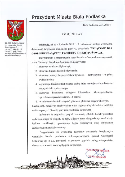Urząd Miasta Biała Podlaska dość szybko zareagował na apel bialskich radnych. Za pomocą Facebooka poinformował, że od jutra tj. 04 kwietnia, zostaje wznowiona możliwości handlu przez producentów i sprzedawców żywności na targowisku miejskim przy Al. Tysiąclecia. Oczywiście z racji panującej pandemii koronawirusa handel może się odbywać z zachowaniem środków bezpieczeństwa wskazanych w komunikacie.