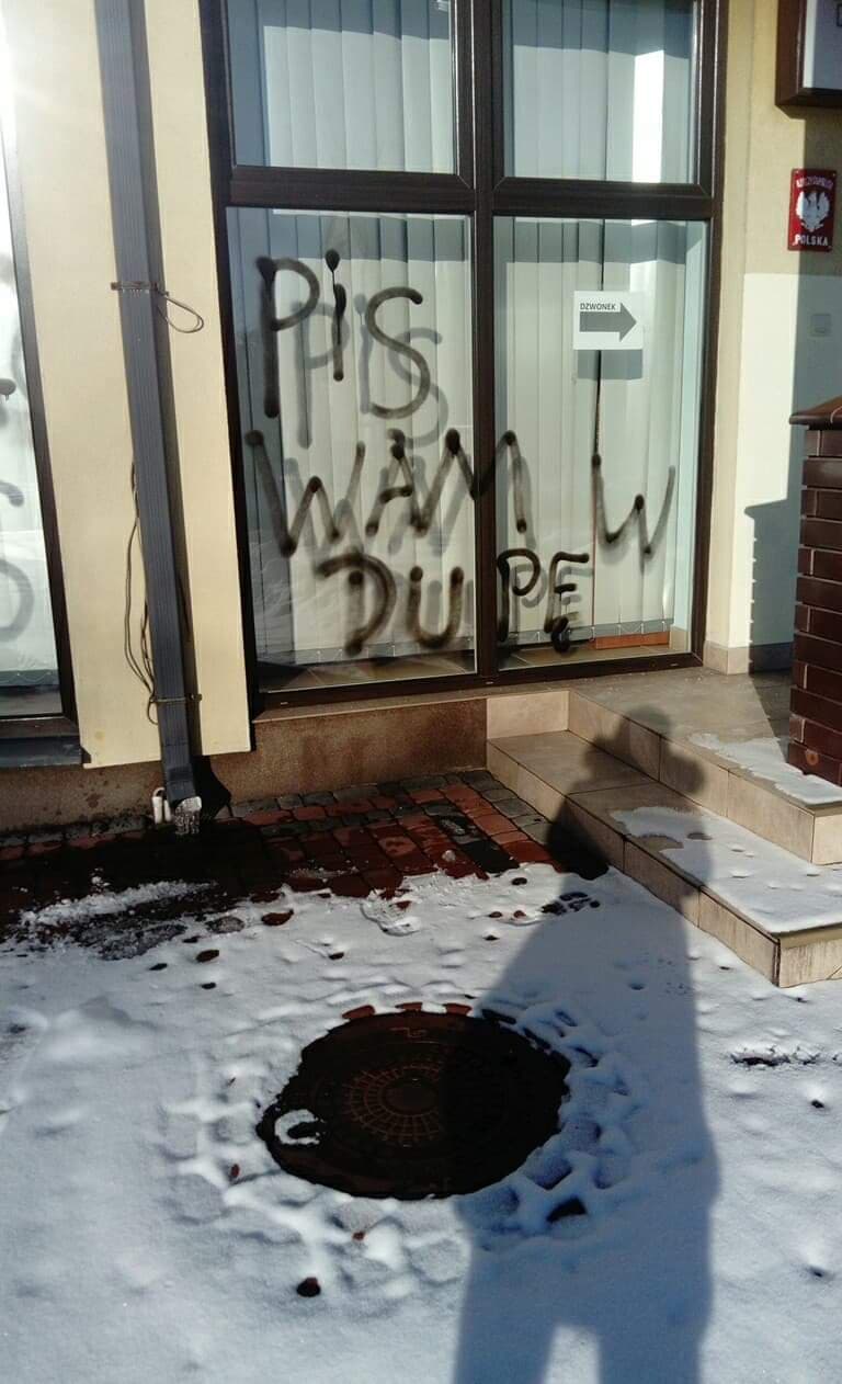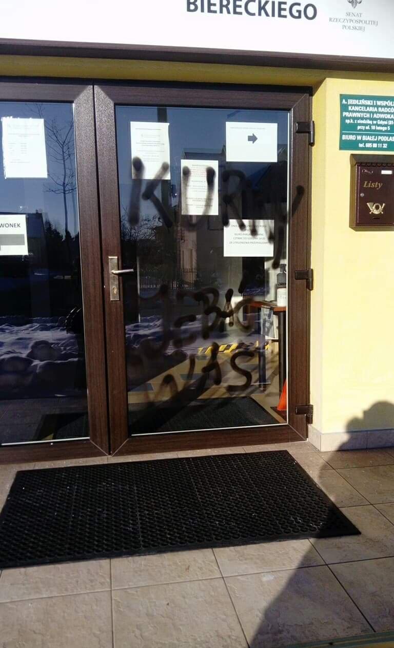 W nocy z 30-31 stycznia, prawdopodobnie jeden sprawca namalował wulgarne hasła na biurze parlamentarnym PiS w Białej Podlaskiej. Wulgarne napisy zostały naniesione sprayem na drzwi i okna biura. Policja prowadzi dochodzenie w tej sprawie.