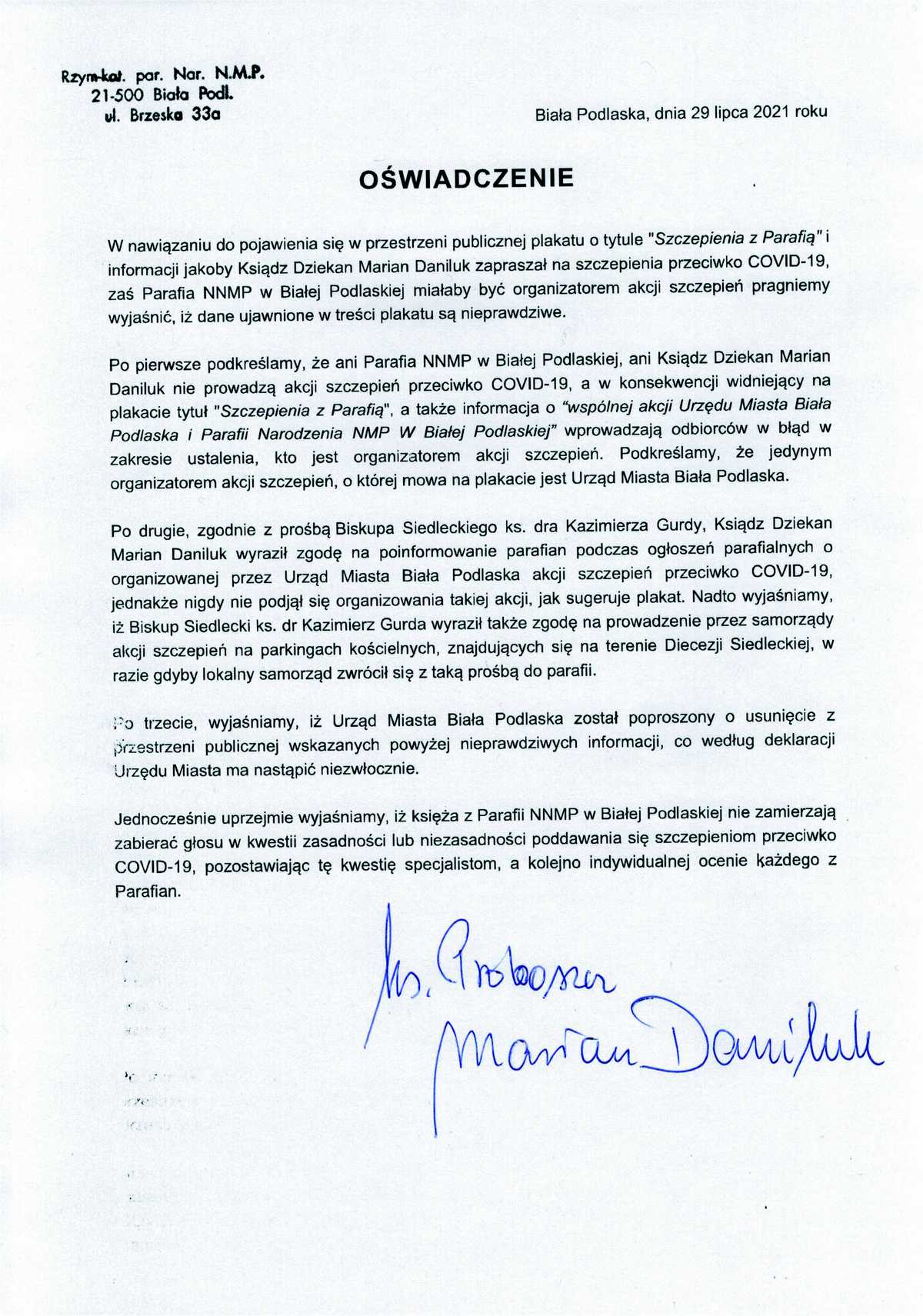 Urząd Miasta Biała Podlaska na swoich stronach internetowych a także stronach szkół i żłobka zachęca do „Szczepienia z Parafią!”. Tym czasem ks. Marian Daniluk wydał oświadczenie w którym dementuje te informacje.