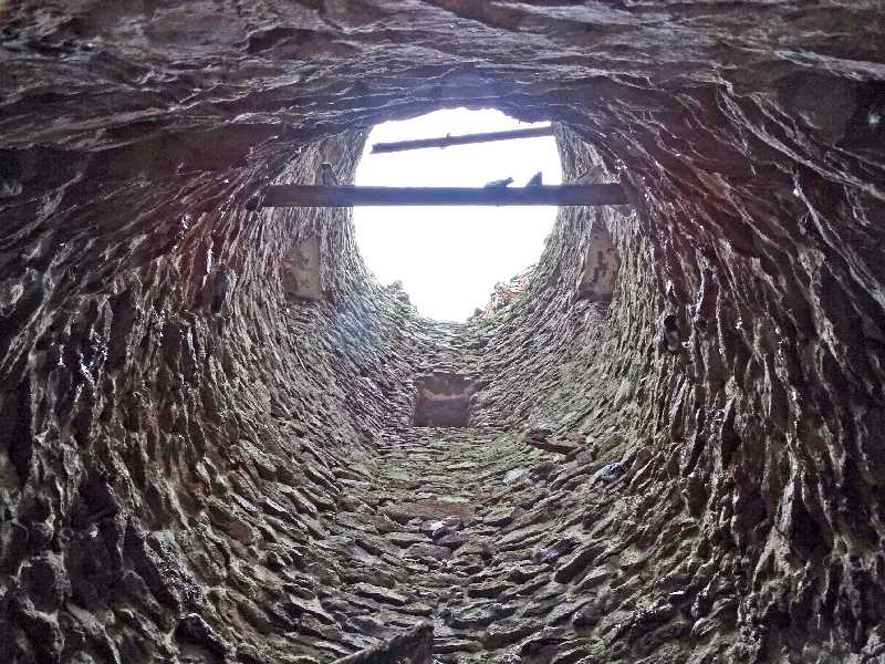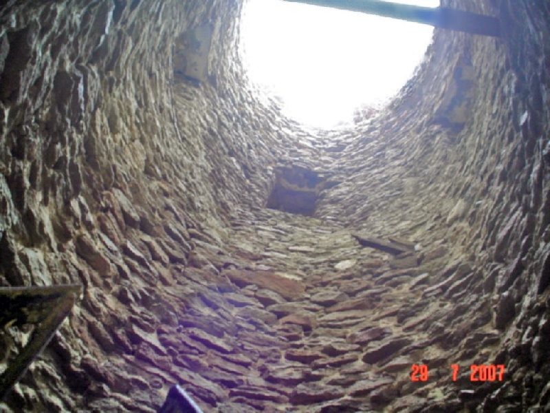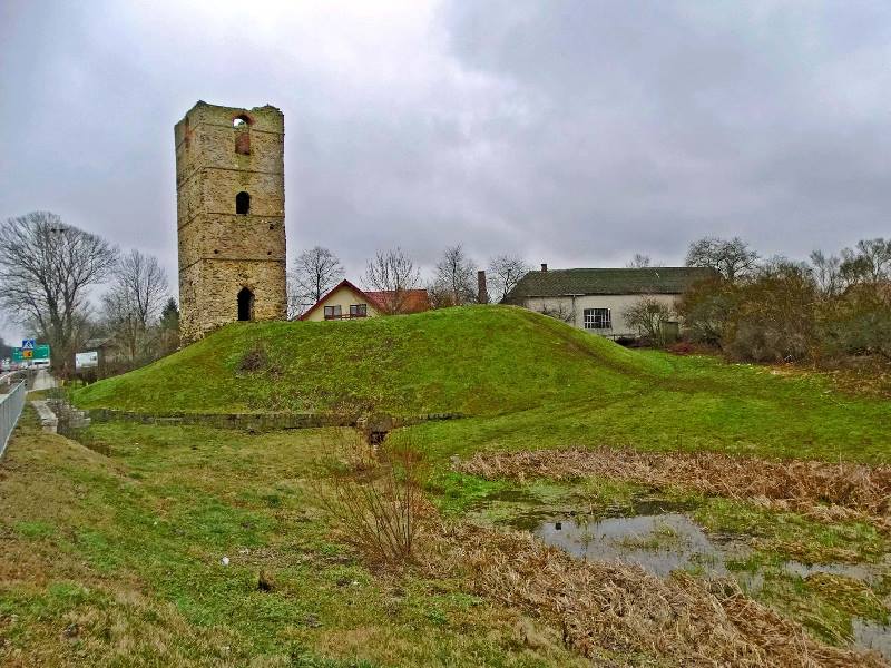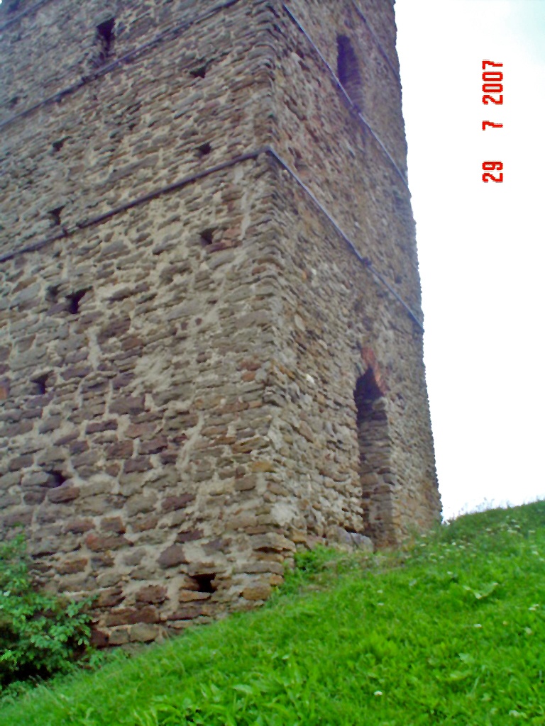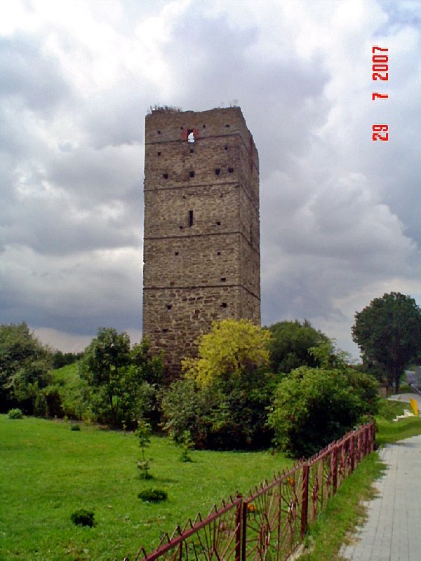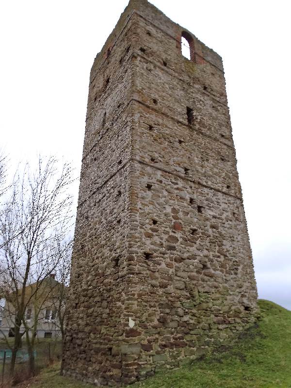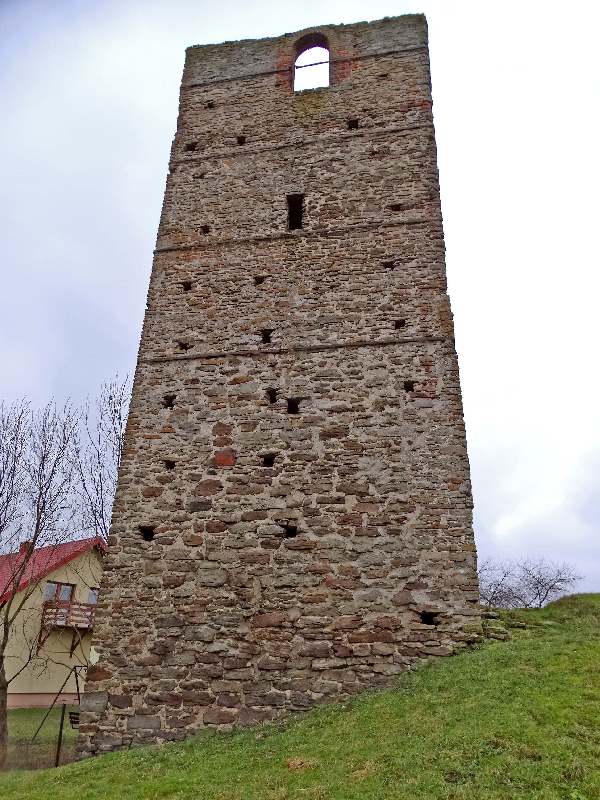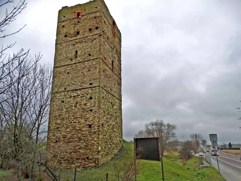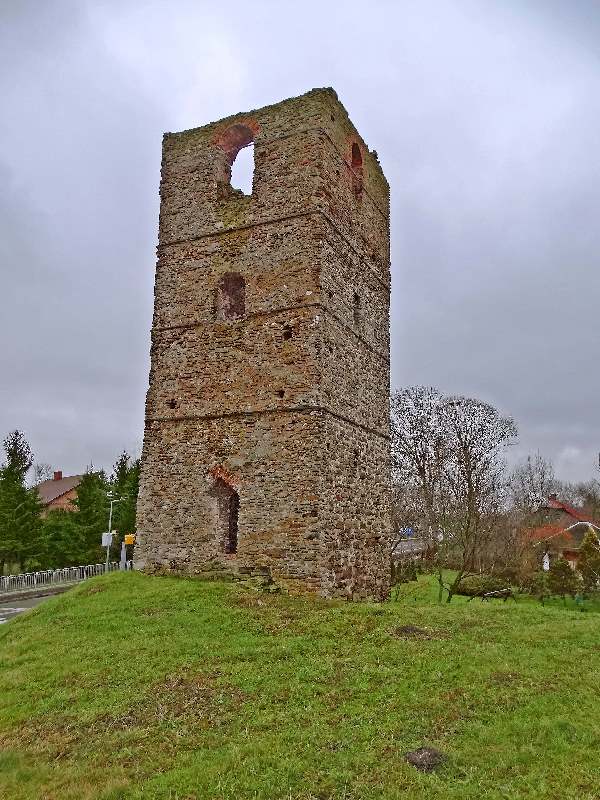 Wieża również z powodu swojej konstrukcji stanowi ciekawostkę gdyż została wybudowana na planie czworoboku na sztucznym wzniesieniu u podnóża, którego wypływa źródełko uważane, że ma cudowne właściwości, tworzące od zachodu niewielkie jeziorko. Może już współcześni mieszkańcy nie wierzą w cudowne właściwości źródła, ale uważają, że woda z niego naprawdę jest dobra. No cóż ja na degustację wody się nie skusiłem, więc się nie wypowiem na ten temat. Nie mniej jednak źródło odegrało w historii wieży ważną rolę, a w związku z jego istnieniem powstała nawet jedna z wielu hipotez na temat przeznaczenia wieży. Wieża posiadała pięć kondygnacji, przy czym najniższa jest obecnie zasypana. Choć zewnątrz wieża wygląda na kwadratową to tak naprawdę ma kształt prostokąta o wymiarach 5,7 x 6,3 m, natomiast wewnątrz ma kształt owalny.
